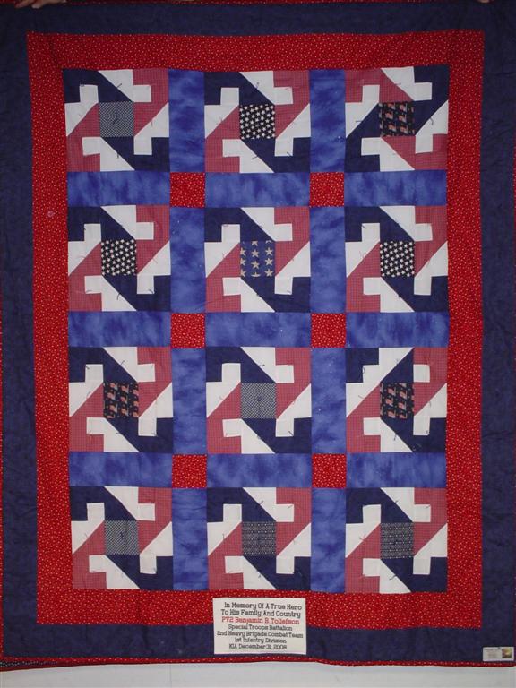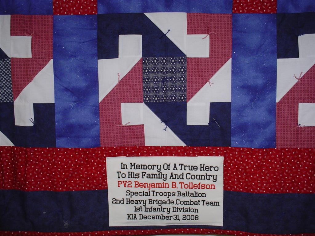 This quilt was made by Freedom Quilts for his family in Honor of Benjamin B. Tollefson.