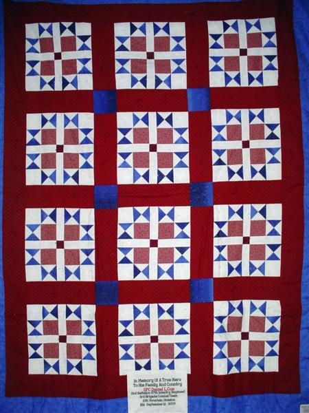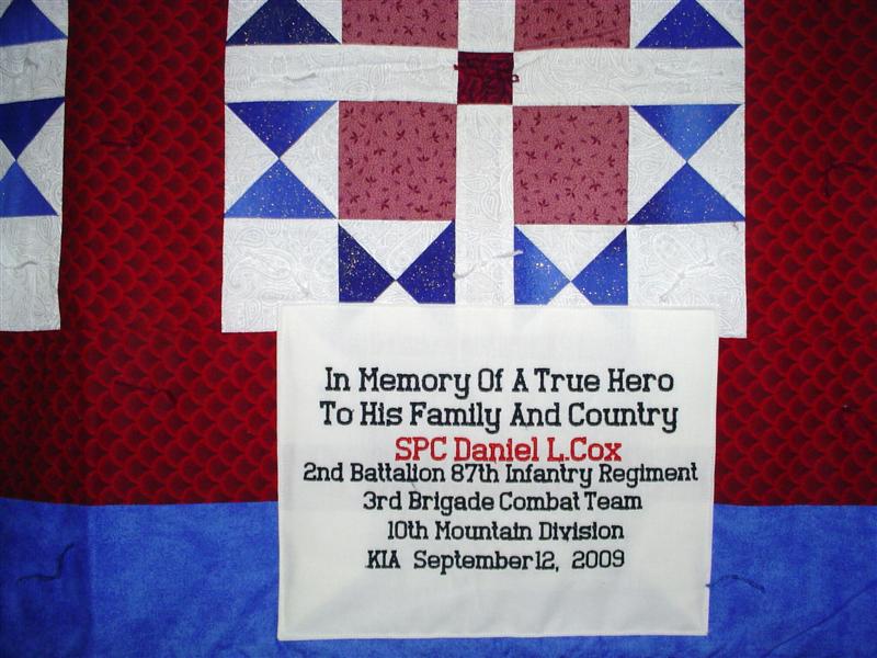 This quilt was made by Freedom Quilts for his family in Honor of Spc. Daniel L. Cox.