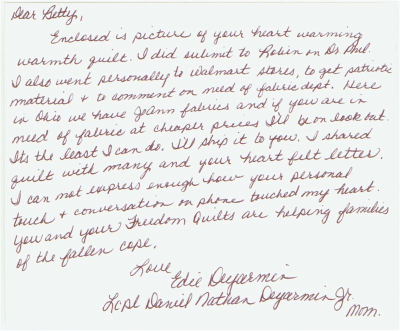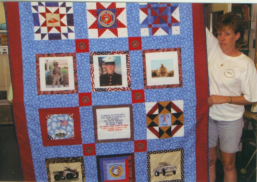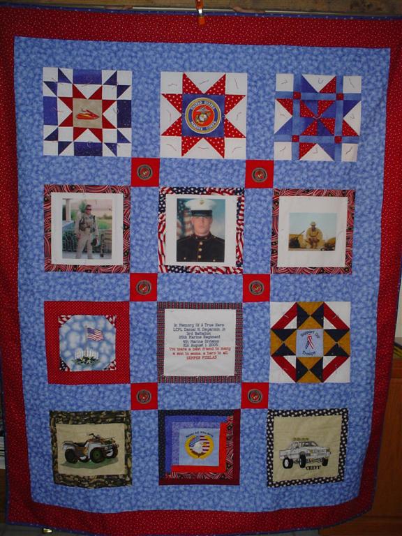 This quilt was made by Freedom Quilts for his family in honor of Marine Lance Cpl. Daniel N. Deyarmin Jr.