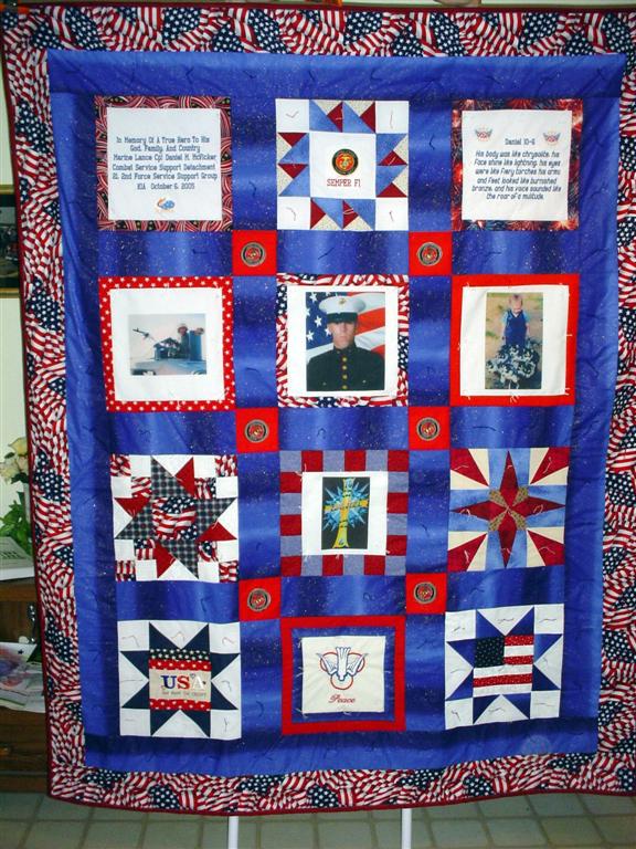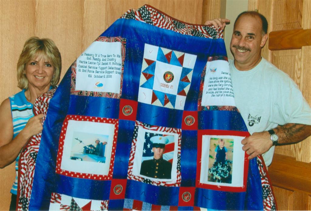 This quilt was made by Freedom Quilts for Mark & Irma McVicker in honor of their son Marine Lance Cpl. Daniel M. McVicker.