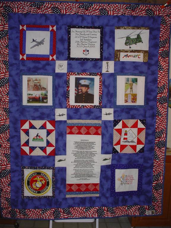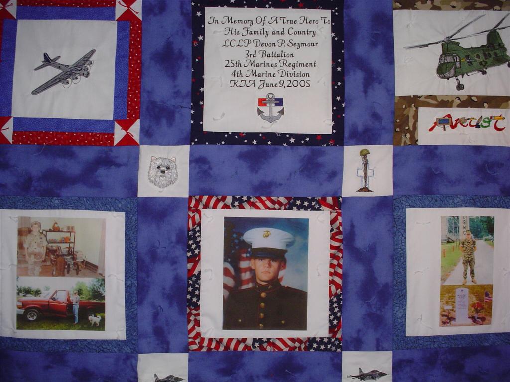 This quilt was made by Freedom Quilts for his family in Honor of Devon P. Seymour.