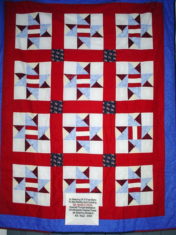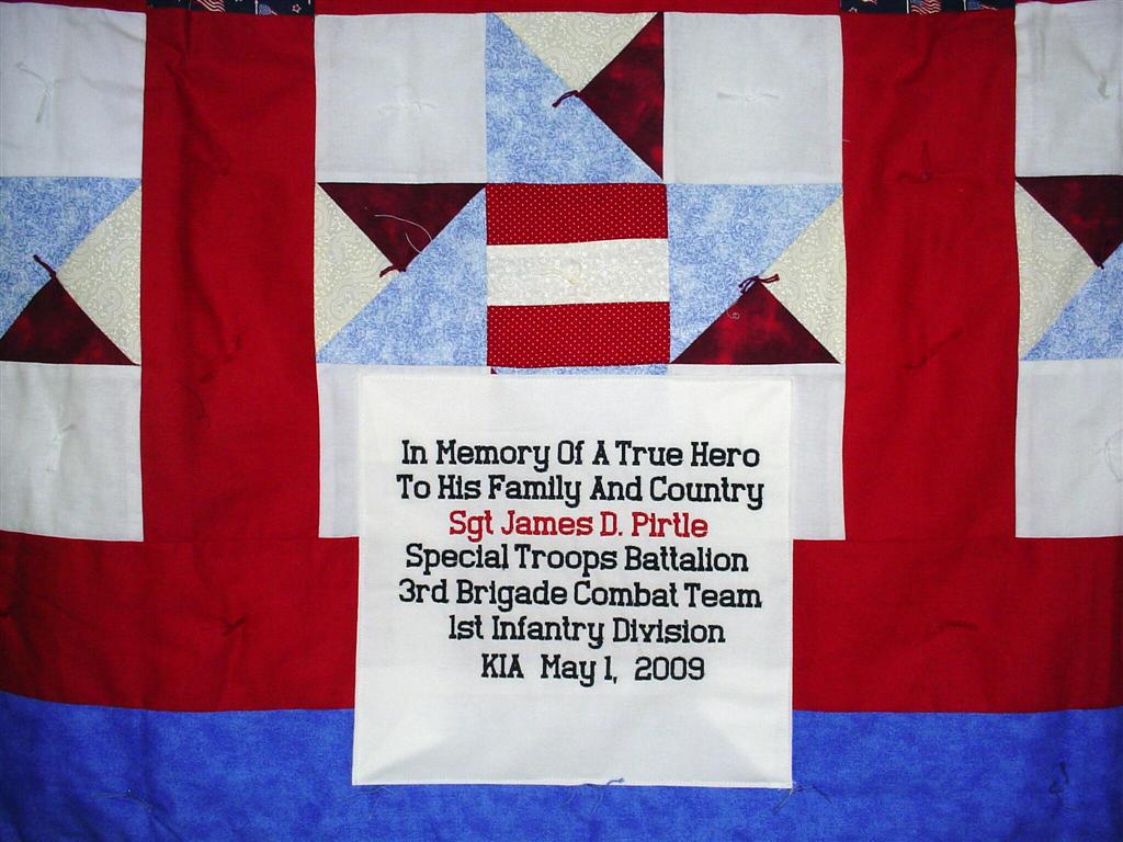 This quilt was made by Freedom Quilts for his family in Honor of James D. Pirtle.