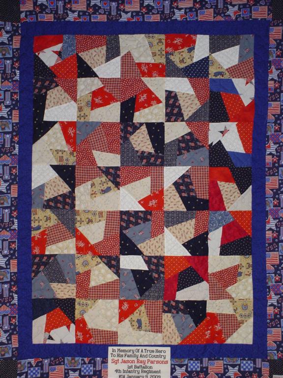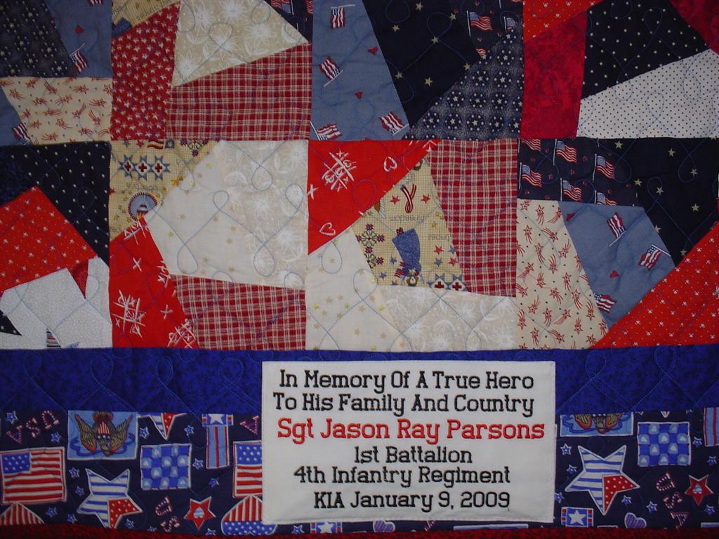 This quilt was made by Freedom Quilts for his family in Honor of Jason R. Parsons.
