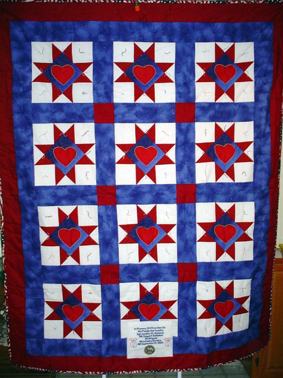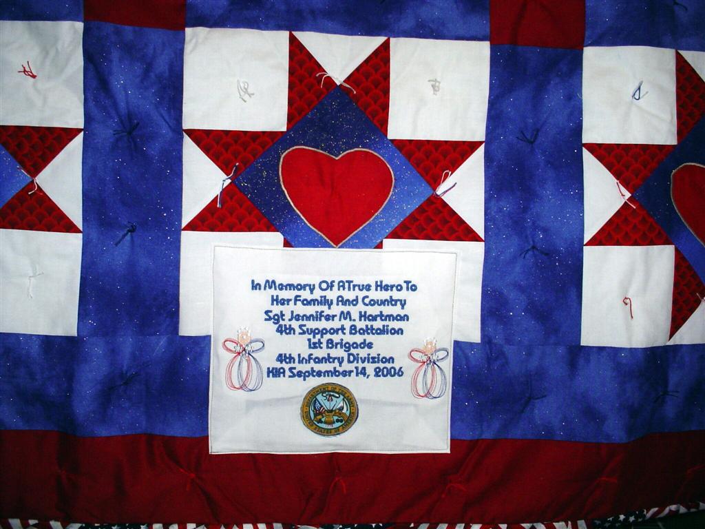 This quilt was made by Freedom Quilts for his family in honor of Sgt. Jennifer M. Hartman.