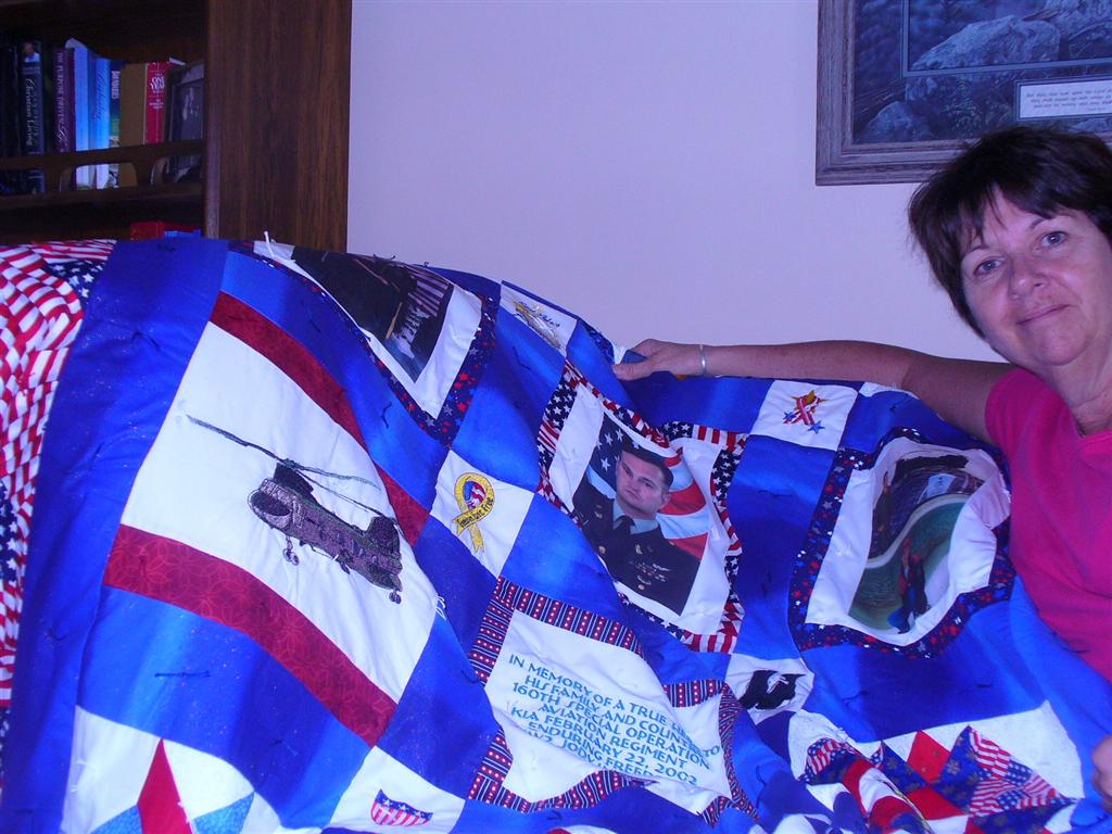 It will be on show this weekend when I have numerous meetings from Bible Study, to a new organization which I am now Vice President off the Families of the Fallen Nightstalkers (160th Regiment). It was the one emblems I did not send you, as Jody was a nightstalker.OOPS! But, it is ok. Because we all know the rest of the quilt is certainly about him, and the man I fell in love with. I am sure Betty, as I share this quilt with my fellow sisters in the regiment that have lost their loved ones, they too will be contacting you. I will of course let them know that it is time consuming and may take awhile. But, WOW!! is it well worth the wait.