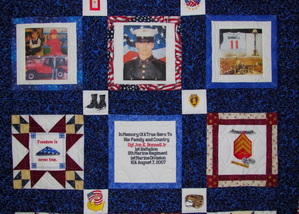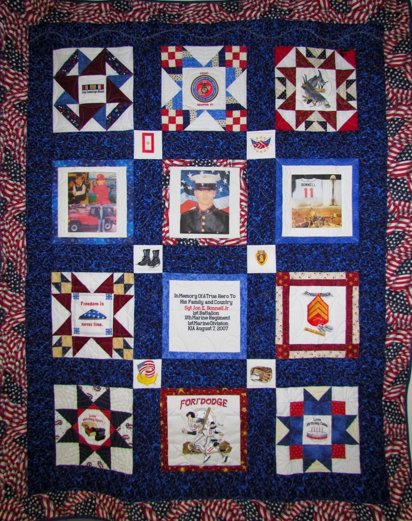 This quilt was made by Freedom Quilts for his family in honor of Marine Sgt. Jon E. Bonnell Jr.