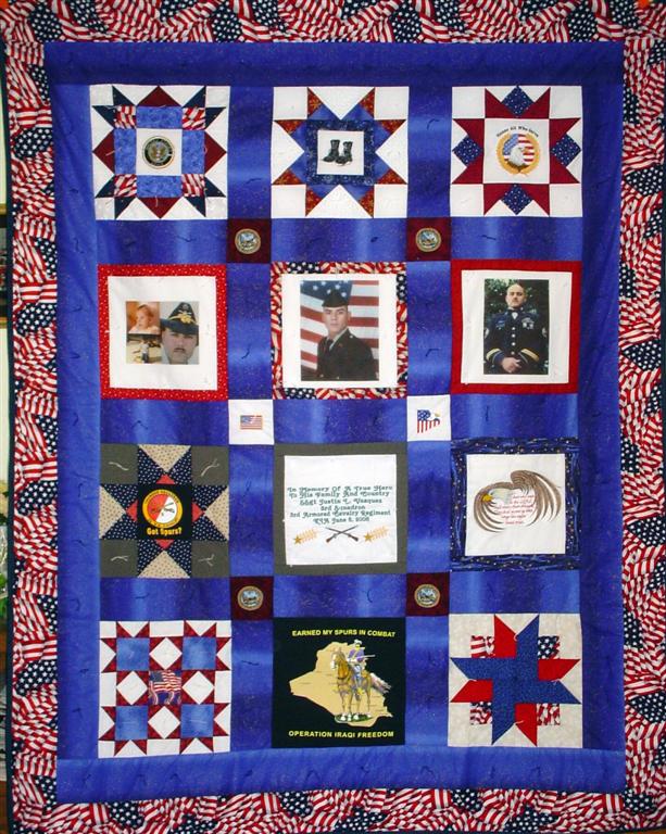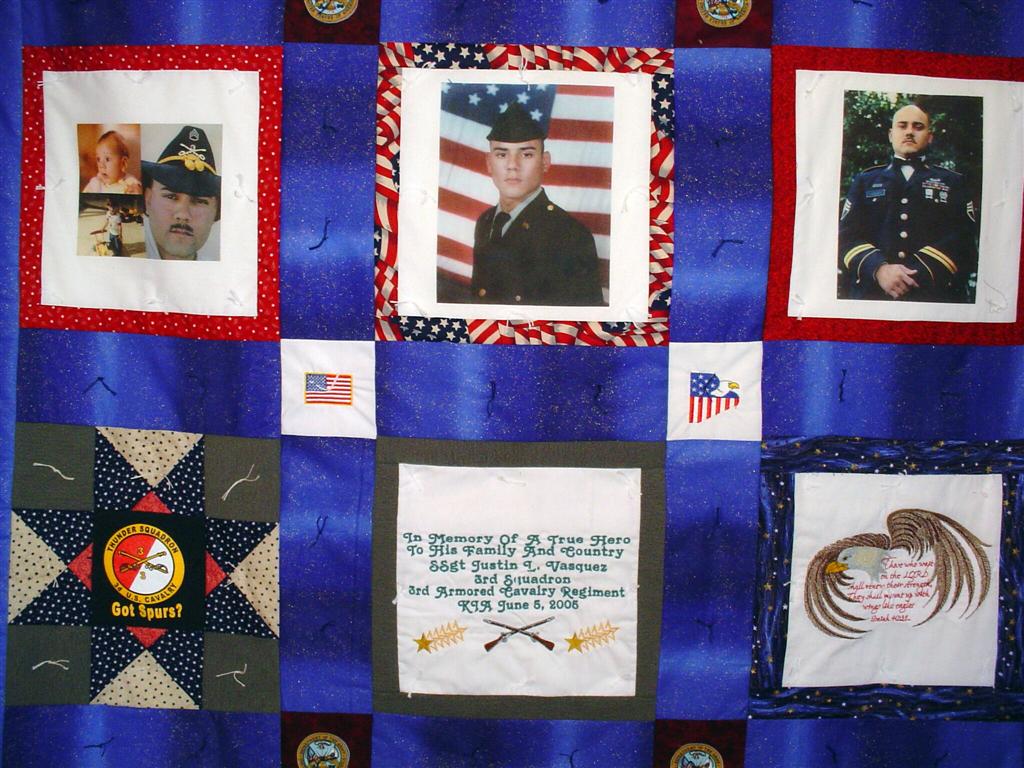 This quilt was made by Freedom Quilts for his family in honor of Justin L. Vasquez.