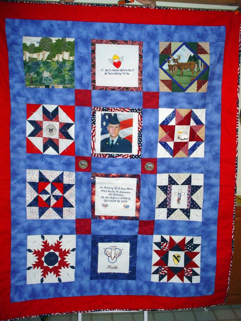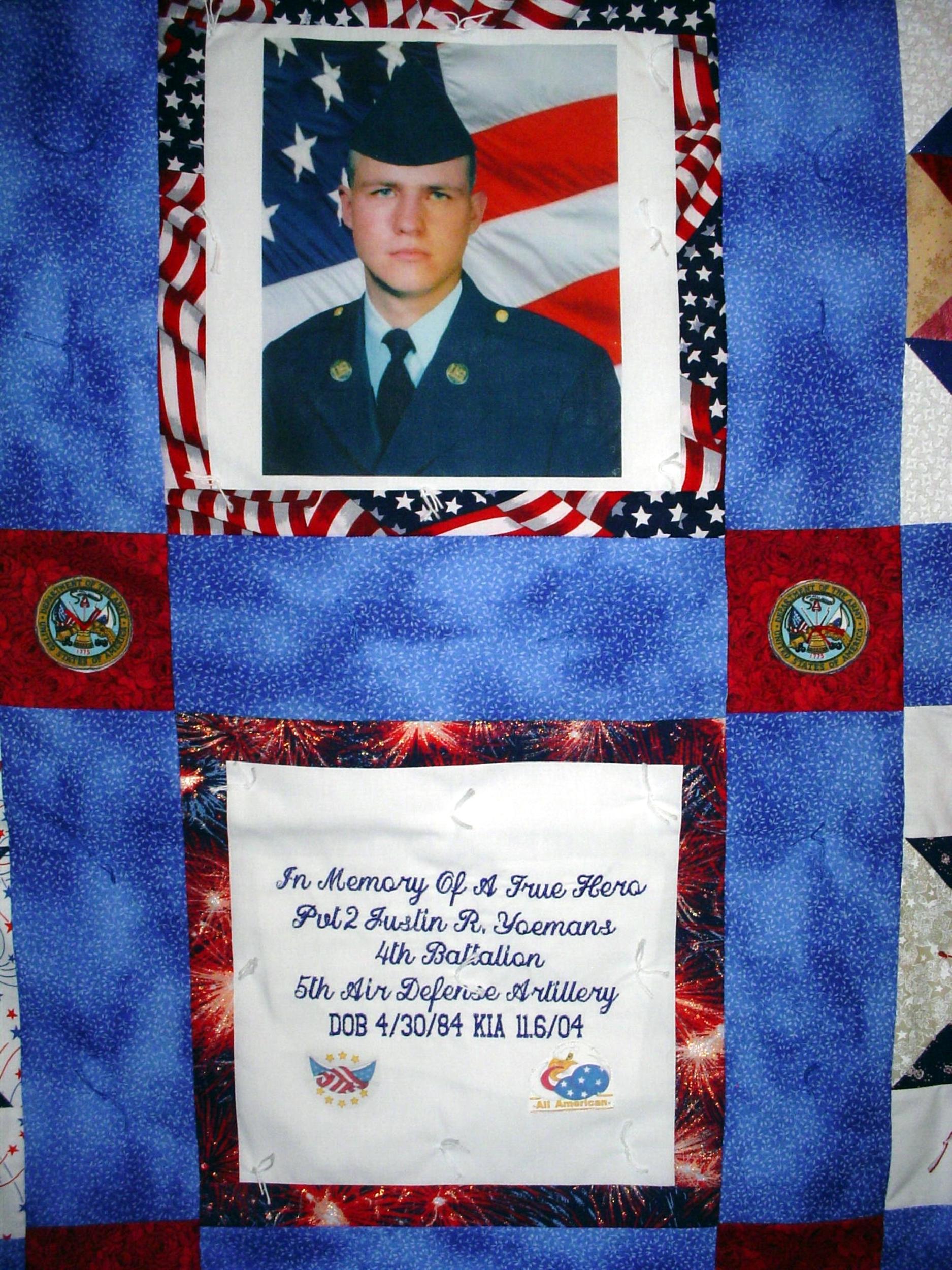 This quilt was made by Freedom Quilts for his family in honor of Pvt. Justin R. Yoemans.