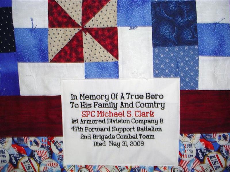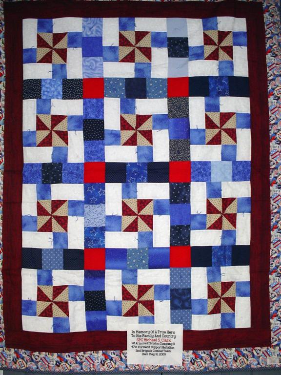 This quilt was made by Freedom Quilts for his family in Honor of Spc. Michael S. Clark.