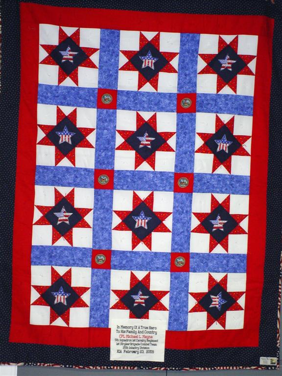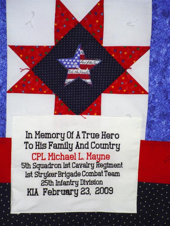 This quilt was made by Freedom Quilts for his family in Honor of Cpl. Michael L. Mayne.