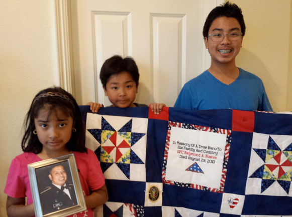 Freedom Quilts made a quilt for Priscilla and her children in honor of Raymond Abellera Nueve. Recently, she was so kind to send us a little note and a picture of her children with their quilt and a photo of their father.