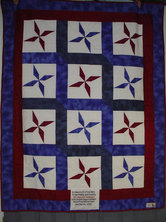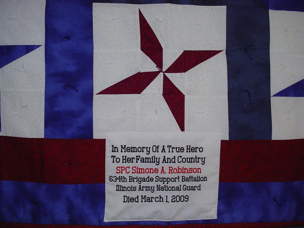 This quilt was made by Freedom Quilts for her family in Honor of Simone A. Robinson.