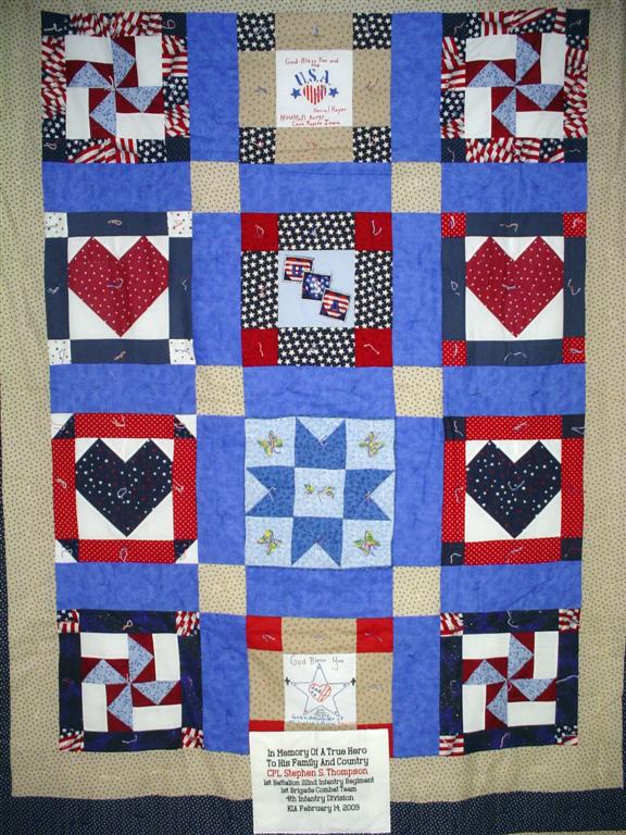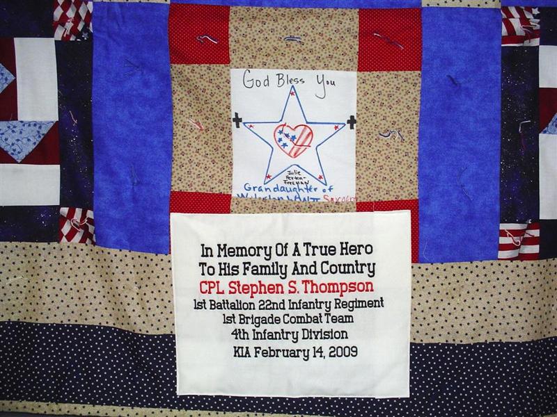 This quilt was made by Freedom Quilts for his family in Honor of Cpl Stephen S. Thompson.