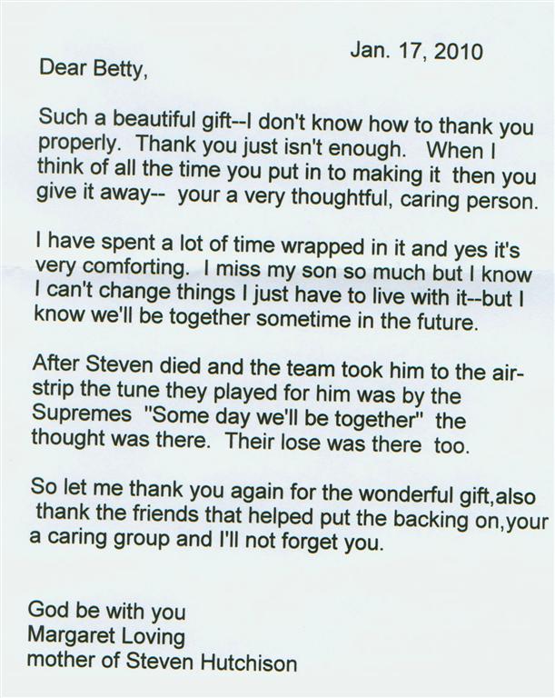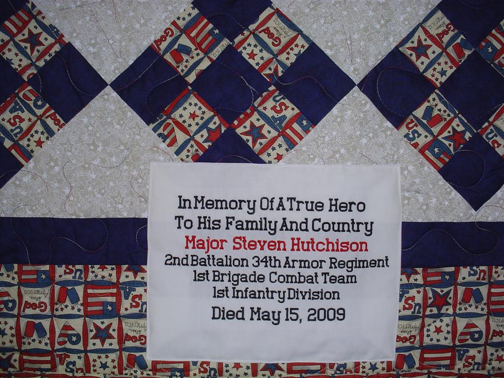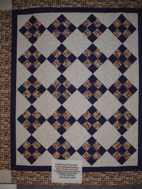 This quilt was made by Freedom Quilts for his family in Honor of Steven Hutchison.