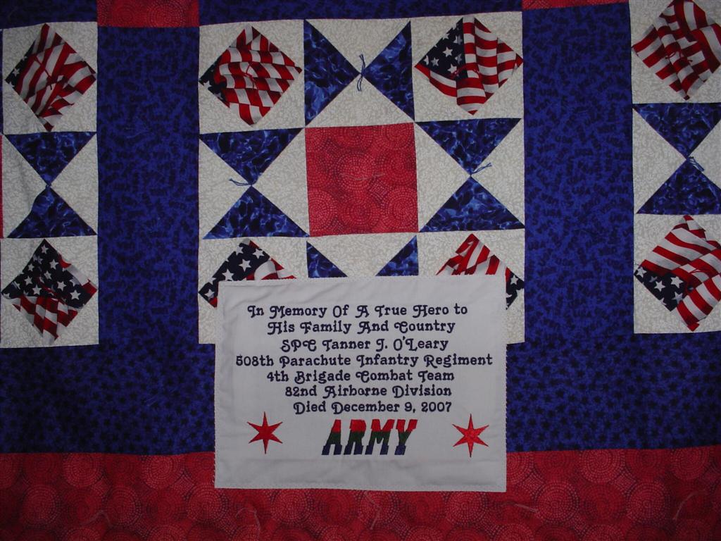 This quilt was made by Freedom Quilts for his family in Honor of Tanner J. O’Leary.